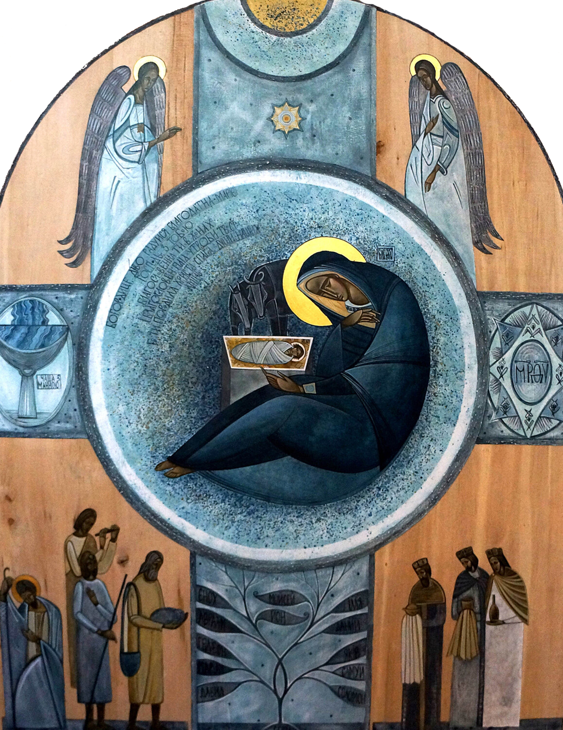 The work, which Solokan renders mostly in blue, gold, ocher, and gray, creates a sense of peace and calm. The blue tunic of the Virgin symbolizes heavenly purity. The gold and golden ochre used for the angels, celestial sphere, and cradle of Jesus signify royal glory, dignity, and wealth. Jesus is swaddled in white—symbolizing purity and holiness.