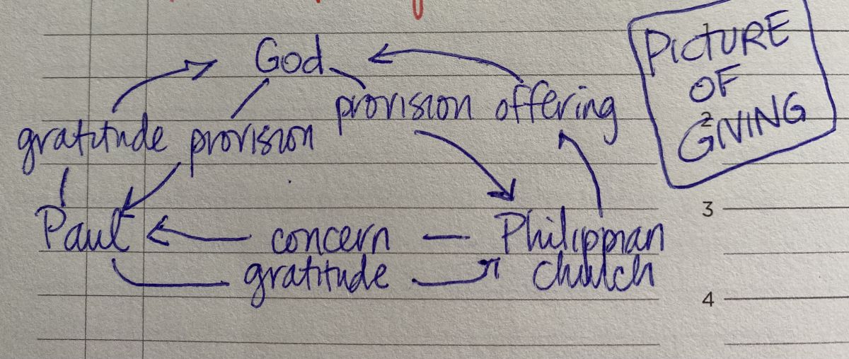 Also below you'll find Michelle's notes of the graphic David drew Sunday showing the giving / receiving relationships between Paul, the Phillipian church and God.